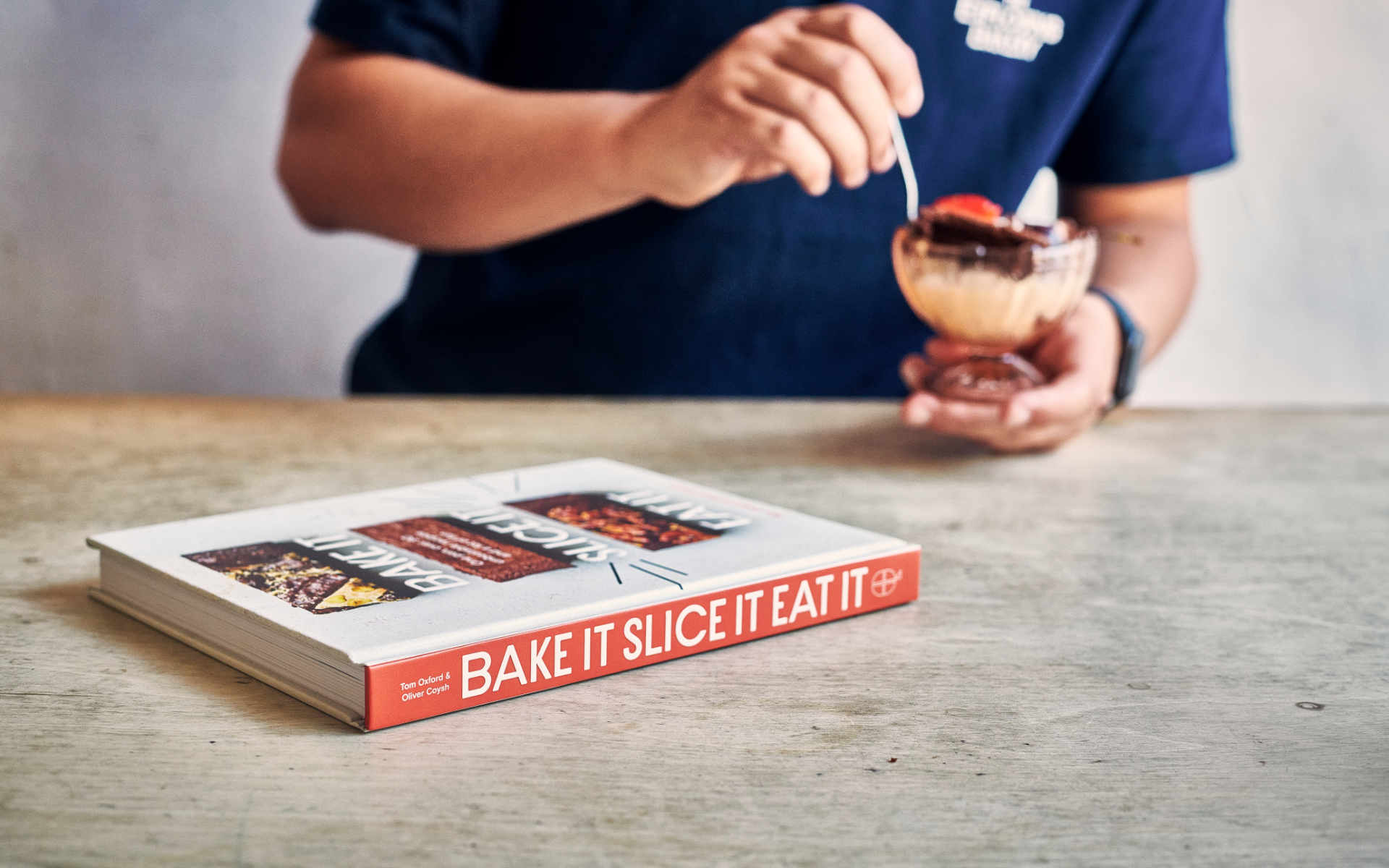 Transfer the mixture to your lined tray and bake for 35–40 minutes until the brownie is just set, but still has a little wobble in the middle. Leave to cool in the tray.