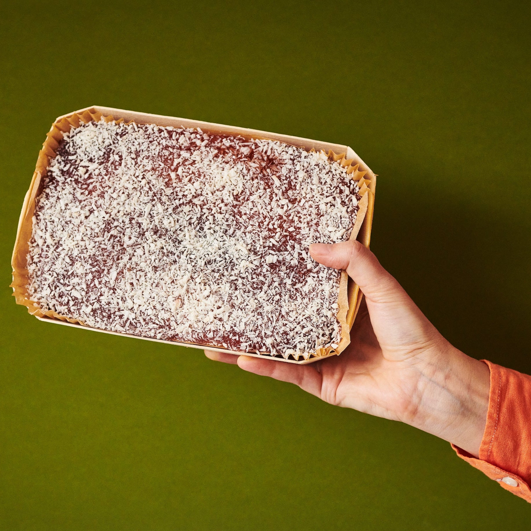 Remove from the oven and, still in the tin, spread the jam over the hot cake, then sprinkle over the coconut, making sure to get an even coverage from edge to edge.